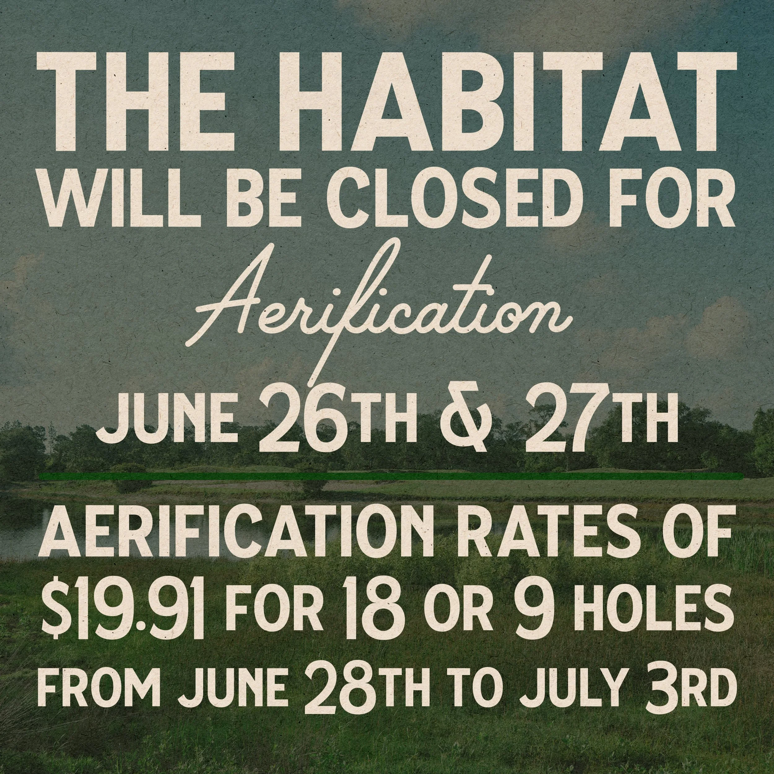 Back to All Events The Habitat Closed For Aerification Monday, June 26, 2023 12:00 AM Tuesday, June 27, 2023 11:55 PM Golf Brevard (map) Google Calendar ICS